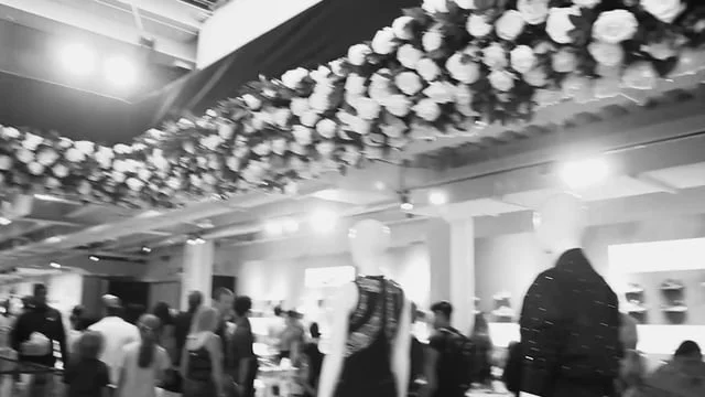 DML re-envisioned the space with a black and white color theme, 5000+ fresh white roses, a chandelier made from tennis racquets and chic details such as matte hangers to add a Maria inspired luxurious aesthetic to the space